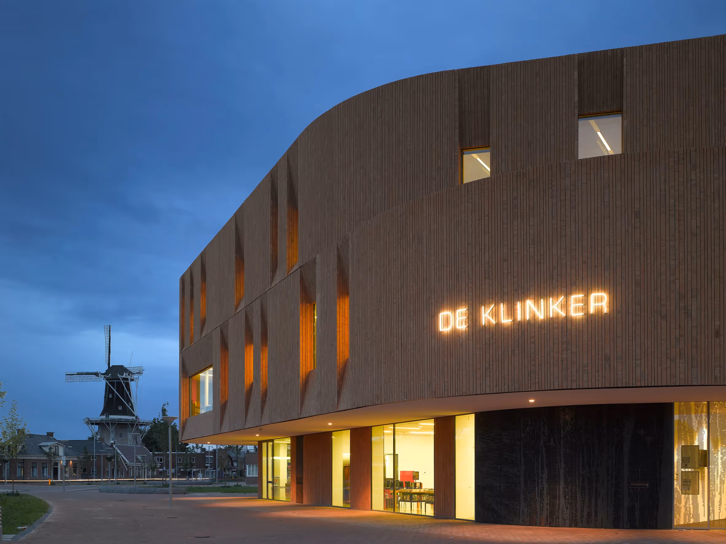 The design of the Culture House fits in Winschoten: the rounded, all-sided building with its sculptural brick façade provides a connection between the small-scale buildings of the historic city center and the wider layout of the post-war expansion districts. The characteristic shape of the building ensures that the available space is fully used, but also reinforces the prominence of De Klinker: the slightly curved facades play with the laws of perspective, visually shortening distances and making the building more visible.