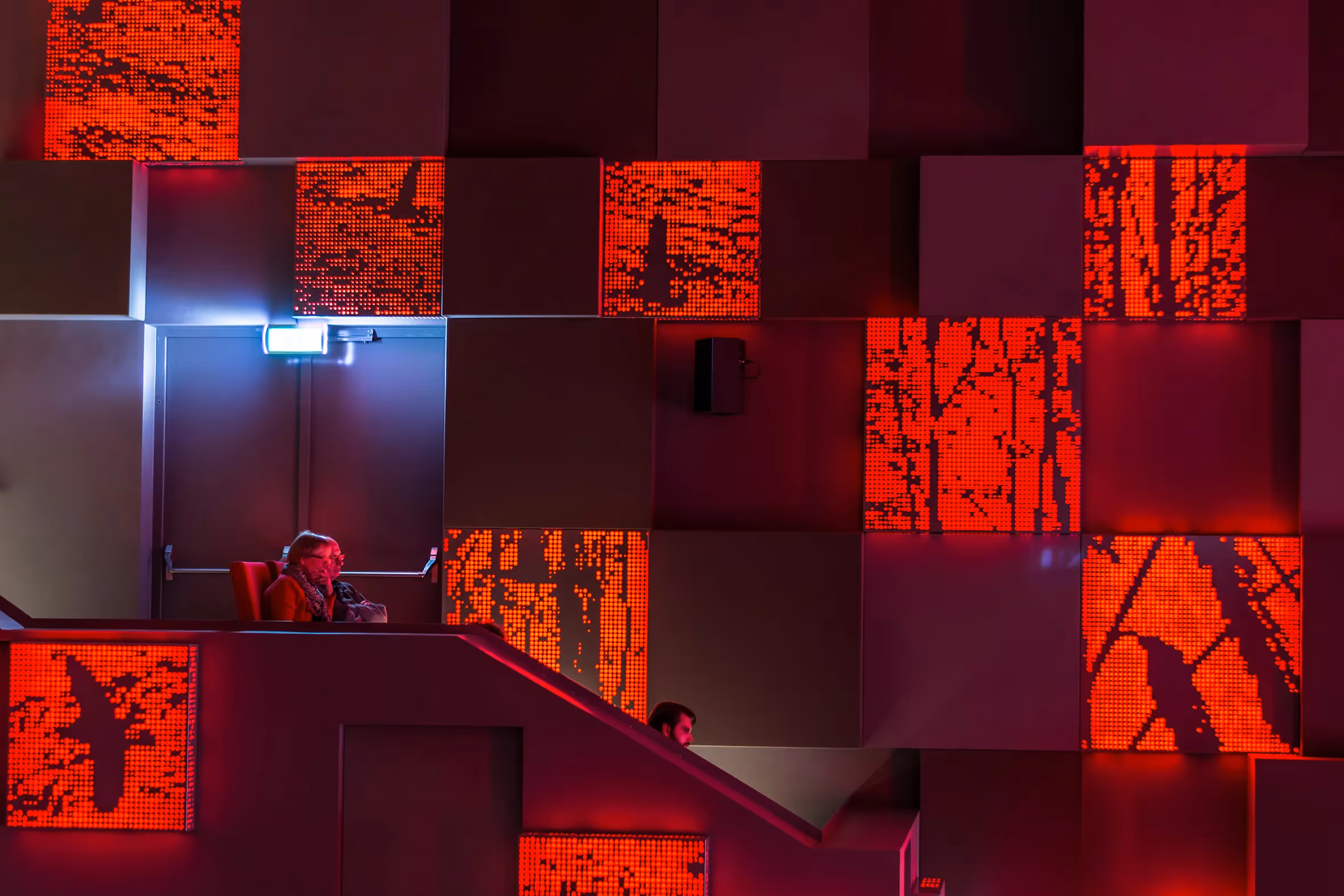 Nowhere do people play as close to the audience as in De Klinker's Theatre Hall. By closing the orchestra pit, the stage can be enlarged towards the hall, which consists of a total of 650 seats spread over the ground floor and the balcony with lodges. The room has a classic yet dynamic atmosphere. The seats and the front canvas are dark red, creating the typical intimate theater feel, while the walls are dark grey and covered with acoustic panels. The acoustic panels are partly covered with perforated plates, with patterns that refer to Groningen — the sea, reeds, wood, birds; via these panels, the light color can be adjusted to the desired atmosphere. Due to sound catchers above the front stage, theater performances can be easily heard throughout the auditorium even without sound reinforcement; when the sound characters are not needed, they can be pulled up to the draw field, making it possible to play even closer to the audience.