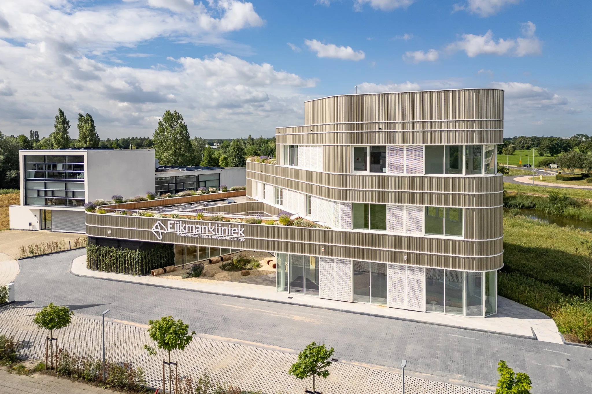 The new treatment center is located on the southwest edge of Nijkerk, in a district that stands out for its special urban design, with “islands” surrounded by water. The treatment center acts as a representative gatehouse for one of these islands, and was therefore extra eye-catching. That's why we chose to give the building a triangular shape that varies in height in a dynamic way, so that the building is seen differently from every angle. The façade design reinforces this dynamic, with rounded corners, beautifully profiled bronze aluminum panels and white horizontal bands.