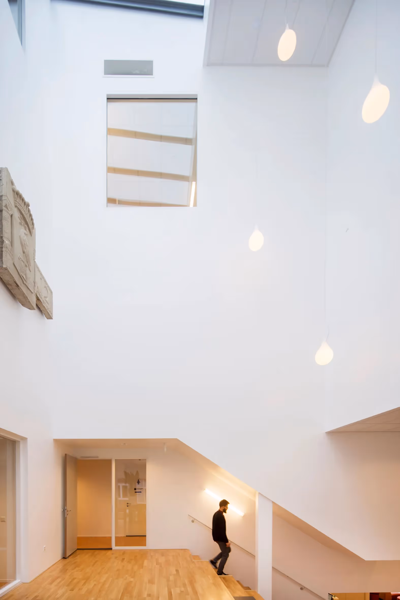 The void above the grandstand stairs leads to the roof and literally divides the building in two. On one side are the communal facilities, which are publicly accessible, and on the other side are the school, which requires more privacy and can be closed off in a zoned manner outside school hours.