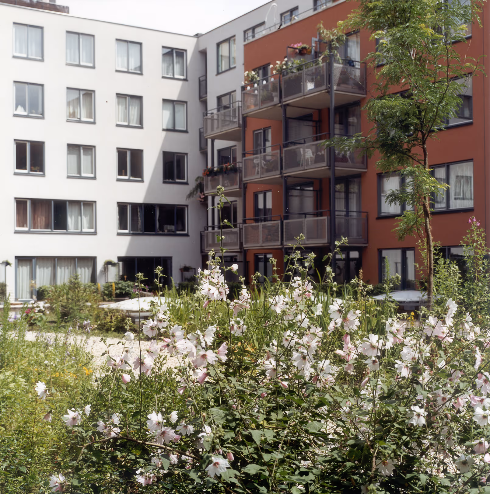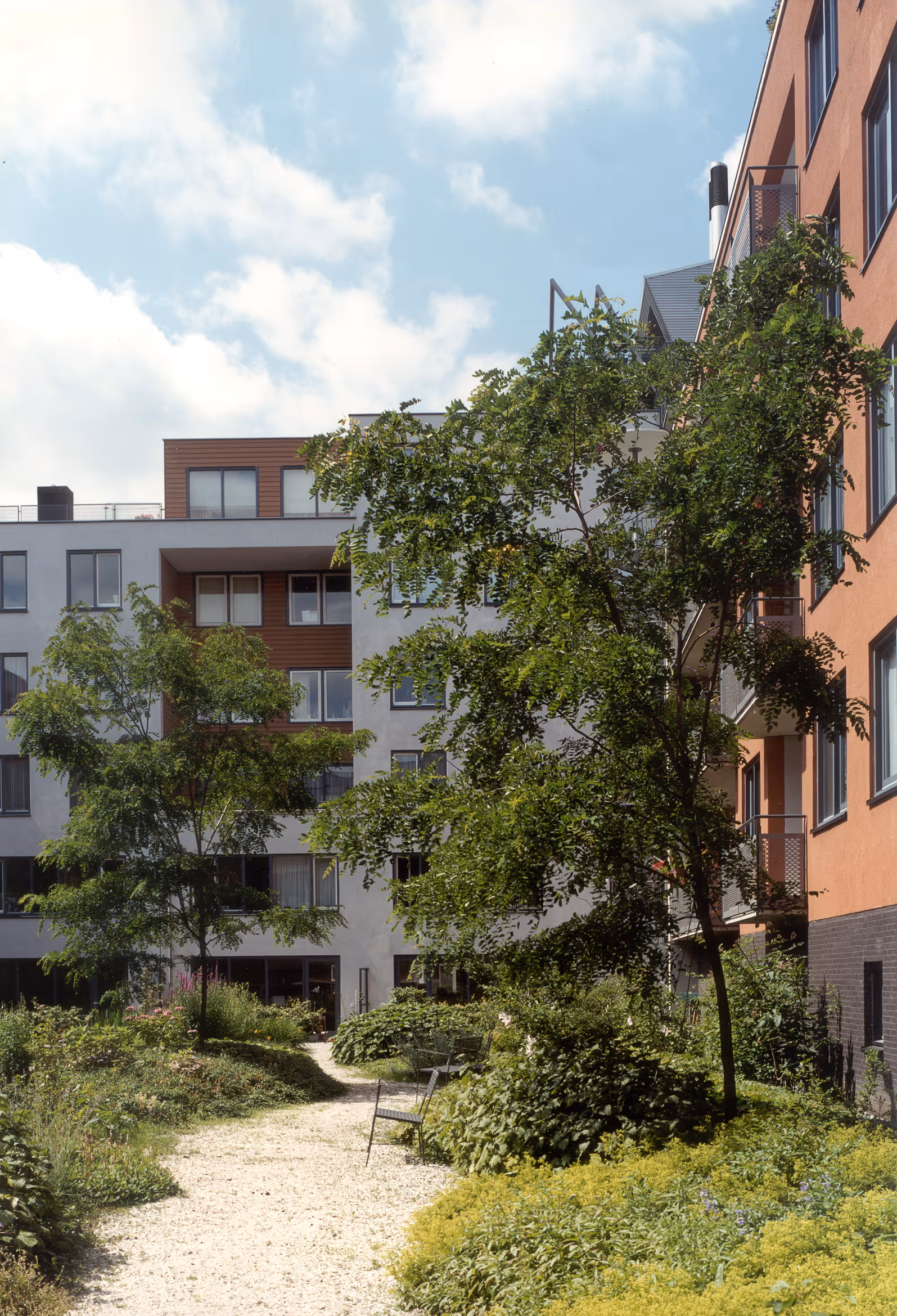 Markenhoven deliberately takes a transitional position between two very different parts of the city. On the Valkenburgerstraat side, the façade wall has the allure of a metropolitan boulevard. On the Rapenburgerstraat, on the contrary, we kept the façade wall very controlled and balanced. The long block is interrupted by two semi-public squares and three courtyards intended for residents. These are enchanting places decorated with water features and plants that remain hidden from the eyes of passers-by.