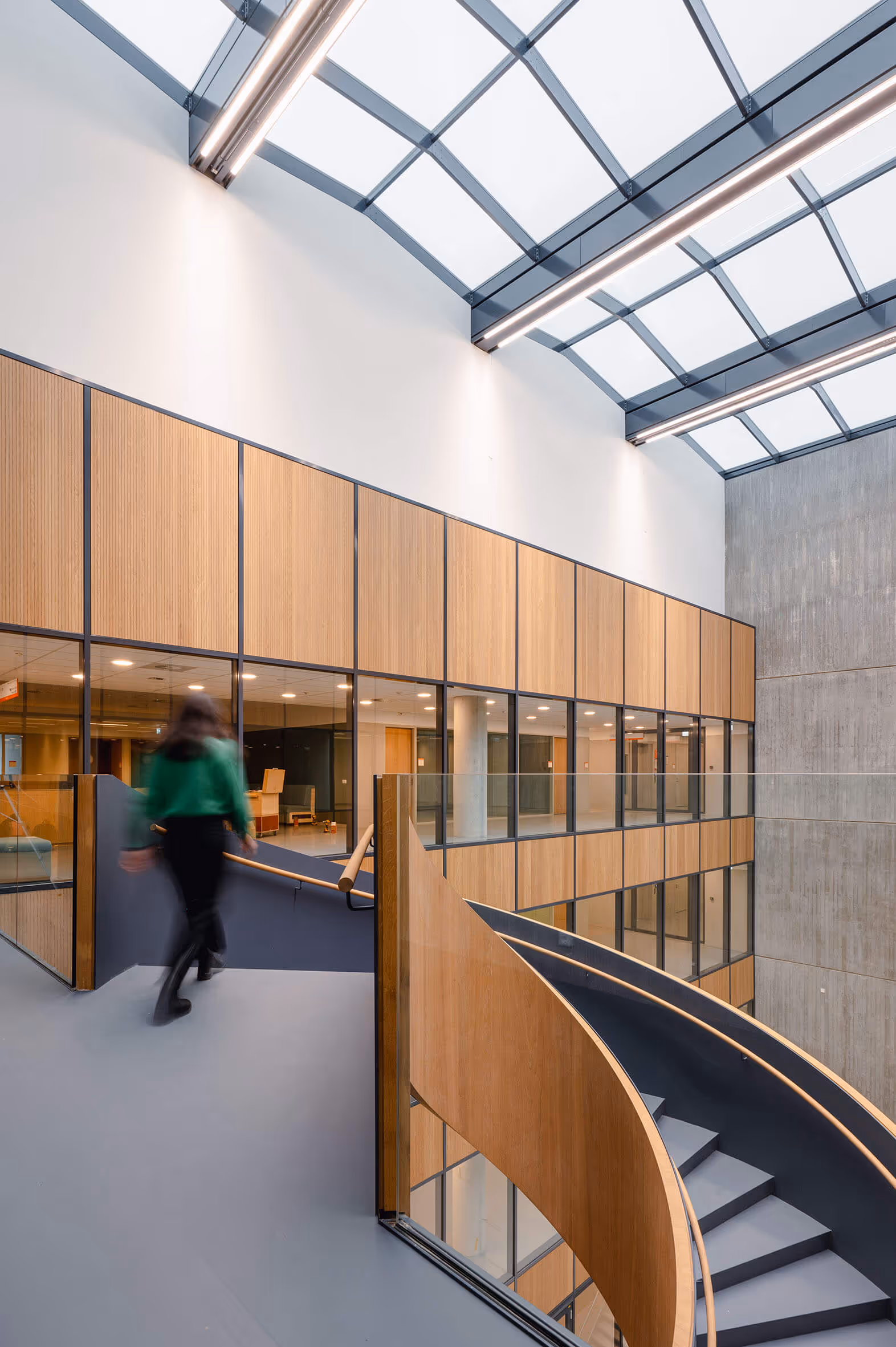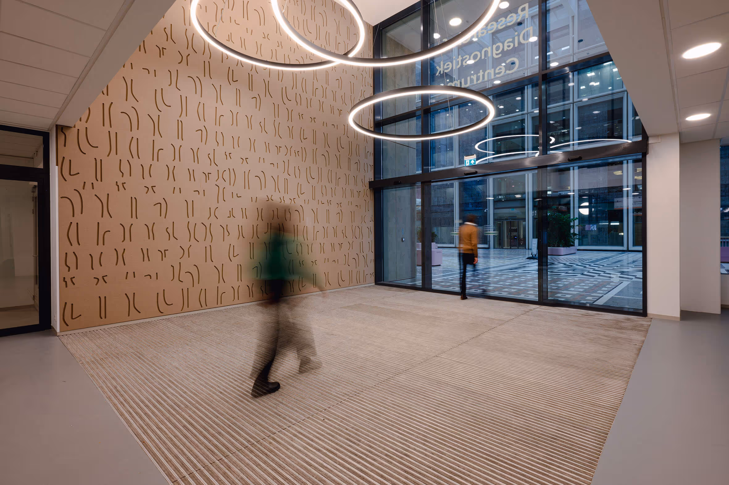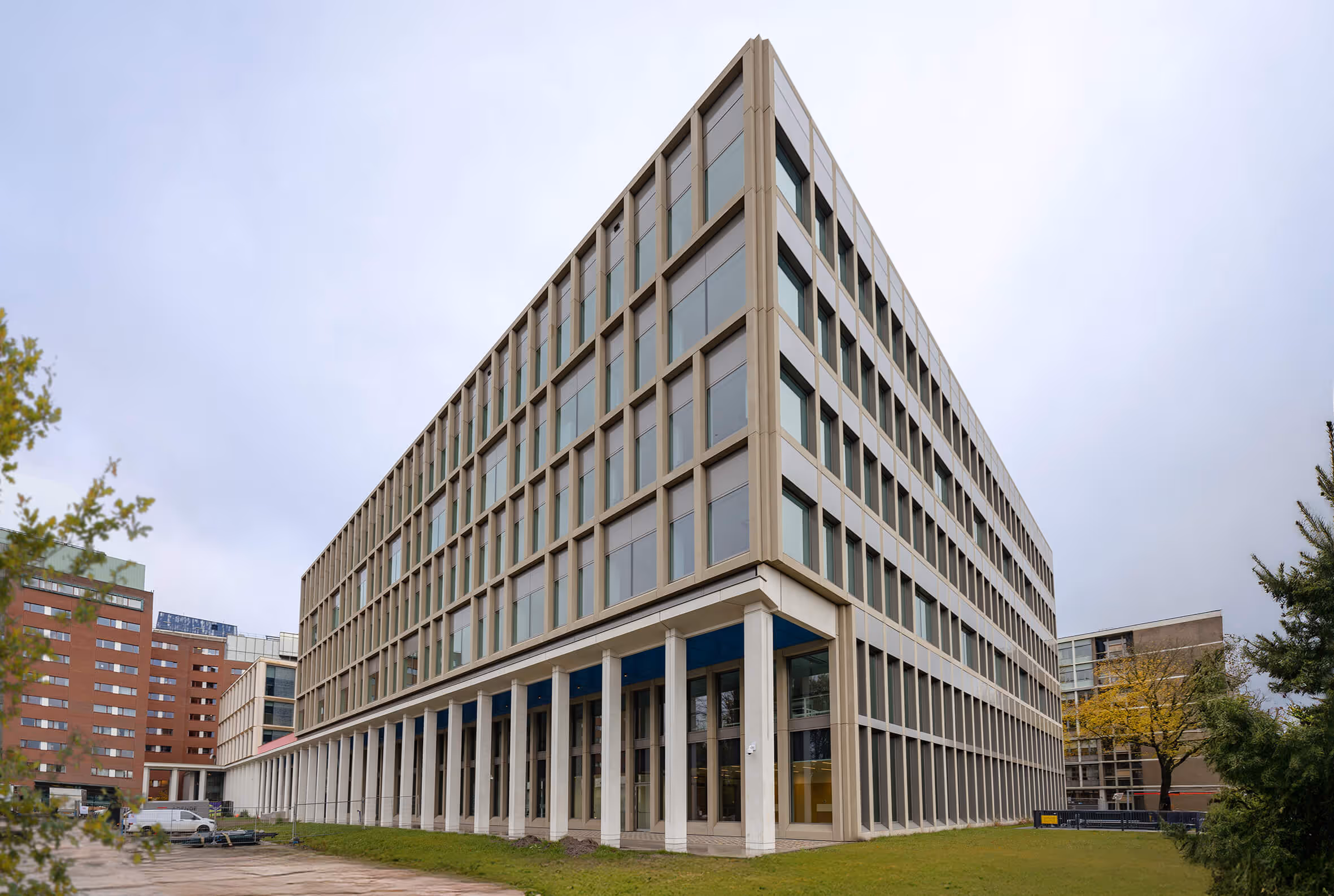 The building is connected by a large glass atrium - designed by Studio Hartzema - to the adjacent Amsterdam UMC Imaging Center, making it easy for people to meet each other and share knowledge. In the exterior, a distinction has therefore been made between the facades on the street and the side of the Botanical Garden, and the facades that cross them — including those on the atrium. The street and garden facades are designed as a framework of sand-coloured fibreglass reinforced concrete, giving them an open and robust appearance at the same time. The concrete returns in the transverse facades, but is alternated with pearl gray aluminum, which already creates the atmosphere of an “inner world” here. In the interior, we opted for subdued colors and materials; light tones, combined with wood, create a calm and warm atmosphere.