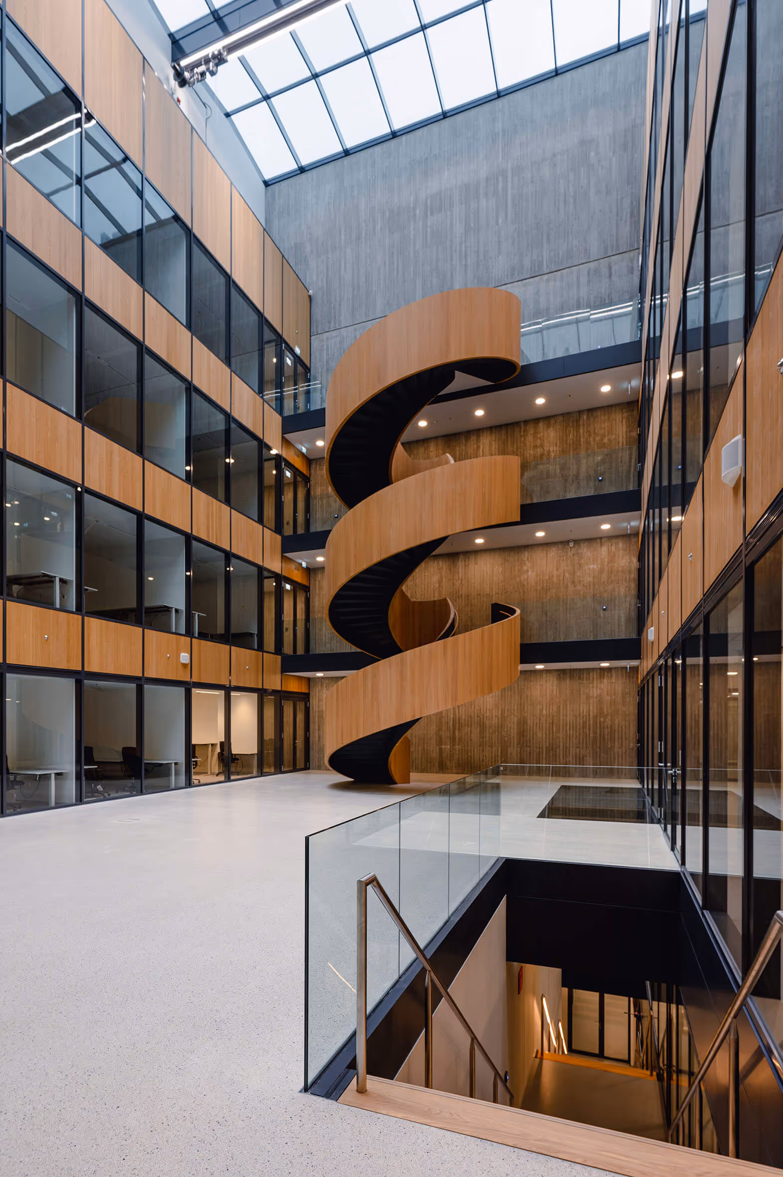 The heart of RDC ADORE is located on the second floor. There, a four-story patio with a glass roof, the so-called courtyard, serves as a central meeting place and at the same time provides light, air and space deep into the building. An eye-catching, characteristic spiral staircase connects the upper floors; the organic shape of this spiral staircase contrasts with the linear layout of the building. On the second floor, we also designed a flexible conference room, the size of which can be adapted to the size of the group.