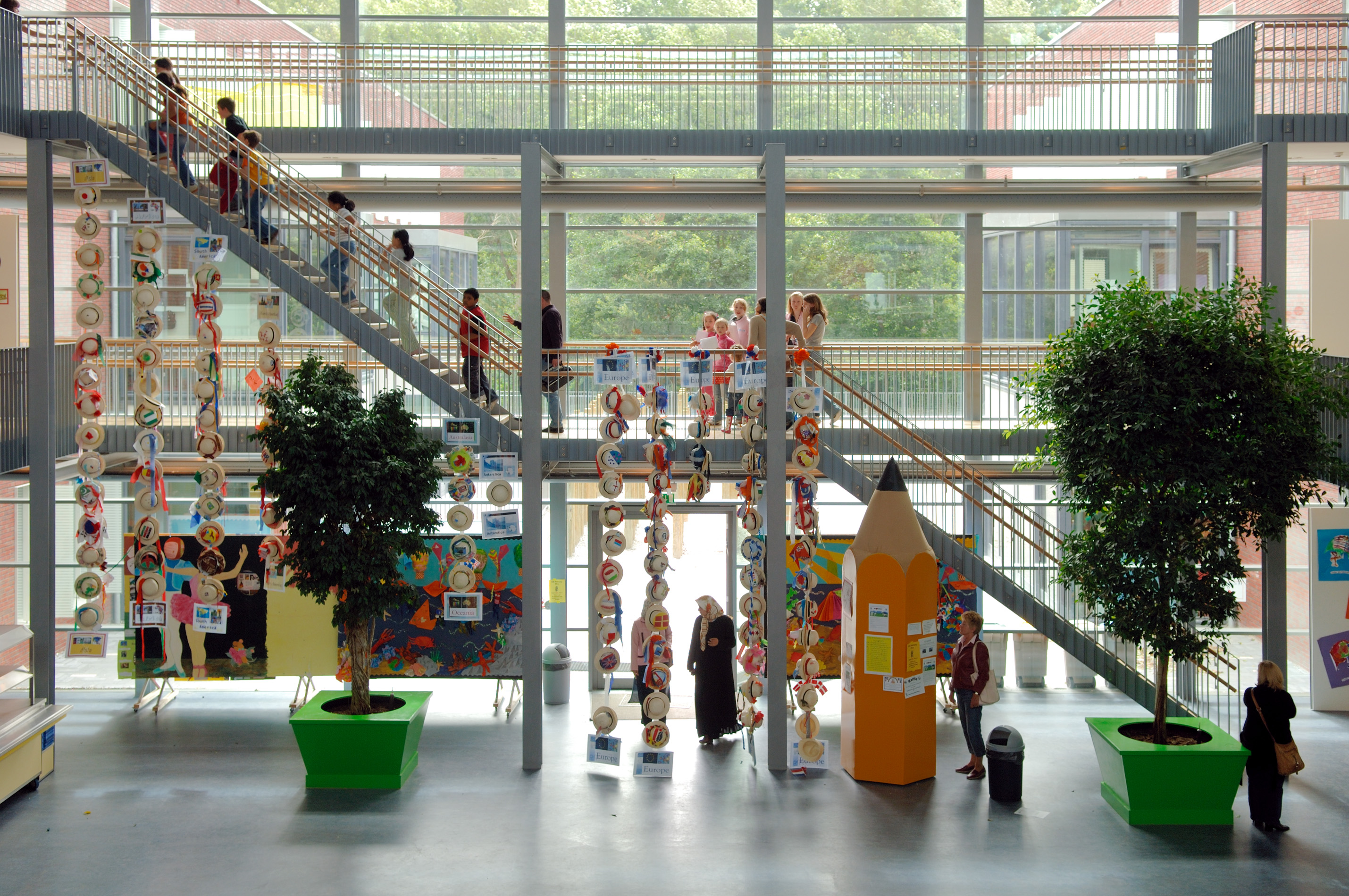 De ‘Plaza’ is een lange hoge ruimte als hart van de organisatie. Het functioneert als centrale entree, leercentrum en ontmoetingsplaats. Een ruimte waar de school zich presenteert aan de internationale gemeenschap.