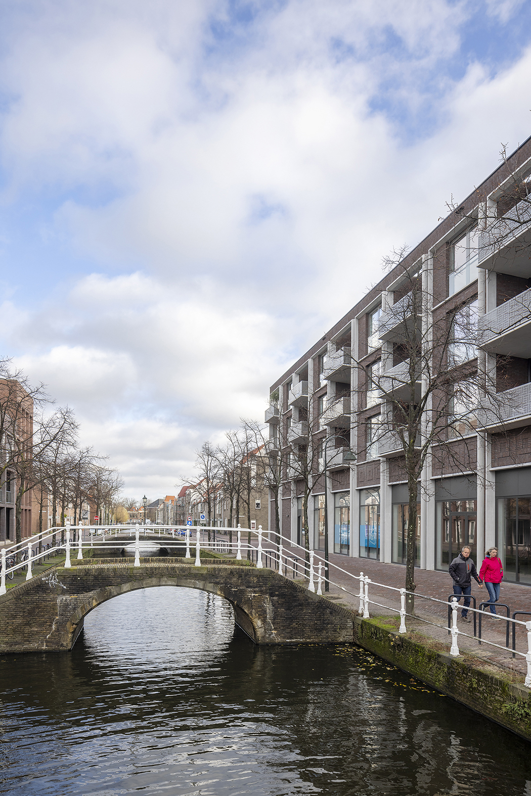 Voor het gevelontwerp hebben we ons laten inspireren door de Delftse gracht, waarbij we de meest typerende eigenschappen van de grachtenwand hebben vertaald naar een aantal richtlijnen, zonder daarbij letterlijk terug te grijpen op het verleden. Grachtenpanden in Delft worden gekenmerkt door een duidelijk gevelbeeld met een plint, een opbouw en een lijst, door een zekere mate van verticaliteit, en door een contrast tussen baksteen en ‘witwaarde’, met materialen als natuursteen of beton. Dit hebben we vertaald naar een abstract, reliëfachtig raster dat het bouwblok vorm geeft en leesbaar maakt; dit raster dient als een basisstructuur waarbinnen de verschillende elementen - balkons, winkelpuien, kozijnen, dichte gevelvlakken, expeditie-ingangen - hun plek kunnen krijgen. U-vormige witte betonnen kaders zorgen voor een verticale dubbele belijning die de contouren van het raster benadrukt. De ruimtes hiertussen zijn ingevuld met staand halfsteens metselverband, terwijl de horizontale betonnen banden terugspringen ten opzichte van de verticale banden; zo krijgt de ‘verticaliteit’ in de gevel meer nadruk. Het raster laat zich lezen als een abstracte interpretatie van de Delftse grachtenwand, een schakeling van vooruitspringende en terugliggende vlakken die doet denken aan de reliëfs van de Delftse kunstenaar Jan Schoonhoven. Zo komen ook hier verschillende schalen samen.