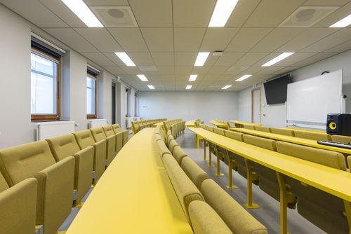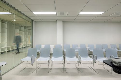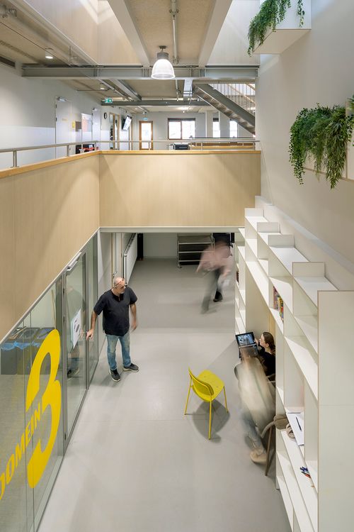 Na de verbouwing heeft het gebouw nu een open en transparante indeling. Door extra openingen in de vloeren - in aanvulling op de bestaande dakkoepel - valt het daglicht diep naar binnen; om dit te versterken hebben we in het midden van het gebouw een vide gecreëerd, die ook dienst doet als ‘ruggengraat’. Tussenwanden zijn zoveel mogelijk uitgevoerd in glas. Om een gevoel van hoogte te houden werden er in de leerdomeinen geen verlaagde plafonds toegepast, maar zijn de installaties juist licht gehouden en in het zicht gelaten.