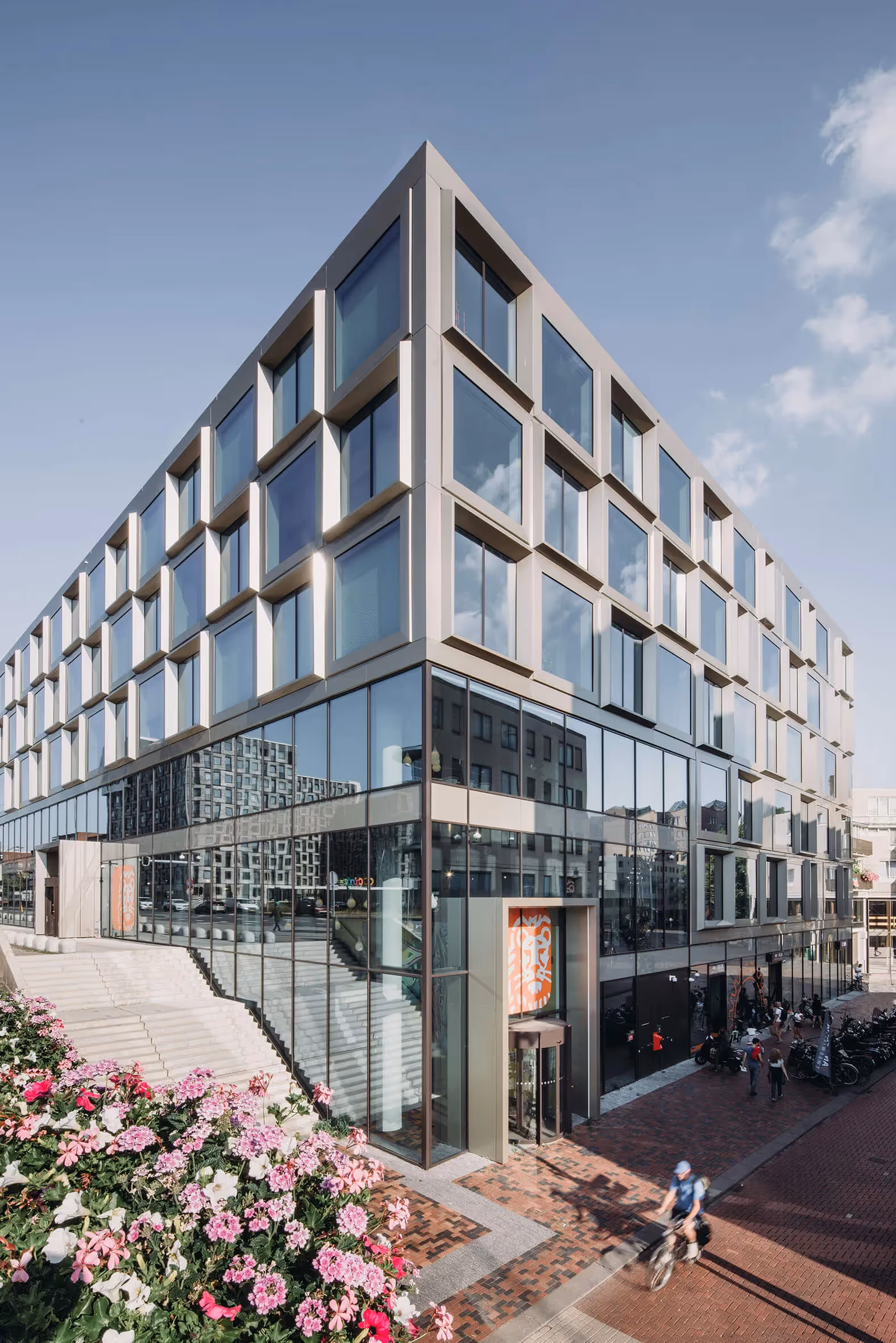 In de plint hebben we - zowel op het niveau van het winkelcentrum als aan de opgetilde Bijlmerdreef – gekozen voor een vlakke, uitnodigende en grotendeels transparant gevel. Zo is, mede door het duidelijke contrast met de gevelelementen op de verdiepingen erboven, goed te zien waar zich de ingangen bevinden. De hoofdentree ligt op het niveau van het winkelcentrum; om deze ingang goed zichtbaar te maken is de transparantie hier naar de hoek toe doorgezet, tot op de eerste verdieping. Door tegelijkertijd de ‘poort’ in het gebouw - die vanaf de Bijlmerdreef naar de parkeergarage leidt - te versmallen en te verlagen, konden we twee van elkaar gescheiden gebouwhelften op de eerste verdieping visueel en ruimtelijk met elkaar verbinden. Hierdoor oogt het gebouw van buiten meer als een eenheid, terwijl er binnen kansen ontstonden om het kantoorgebouw flexibeler te gebruiken.