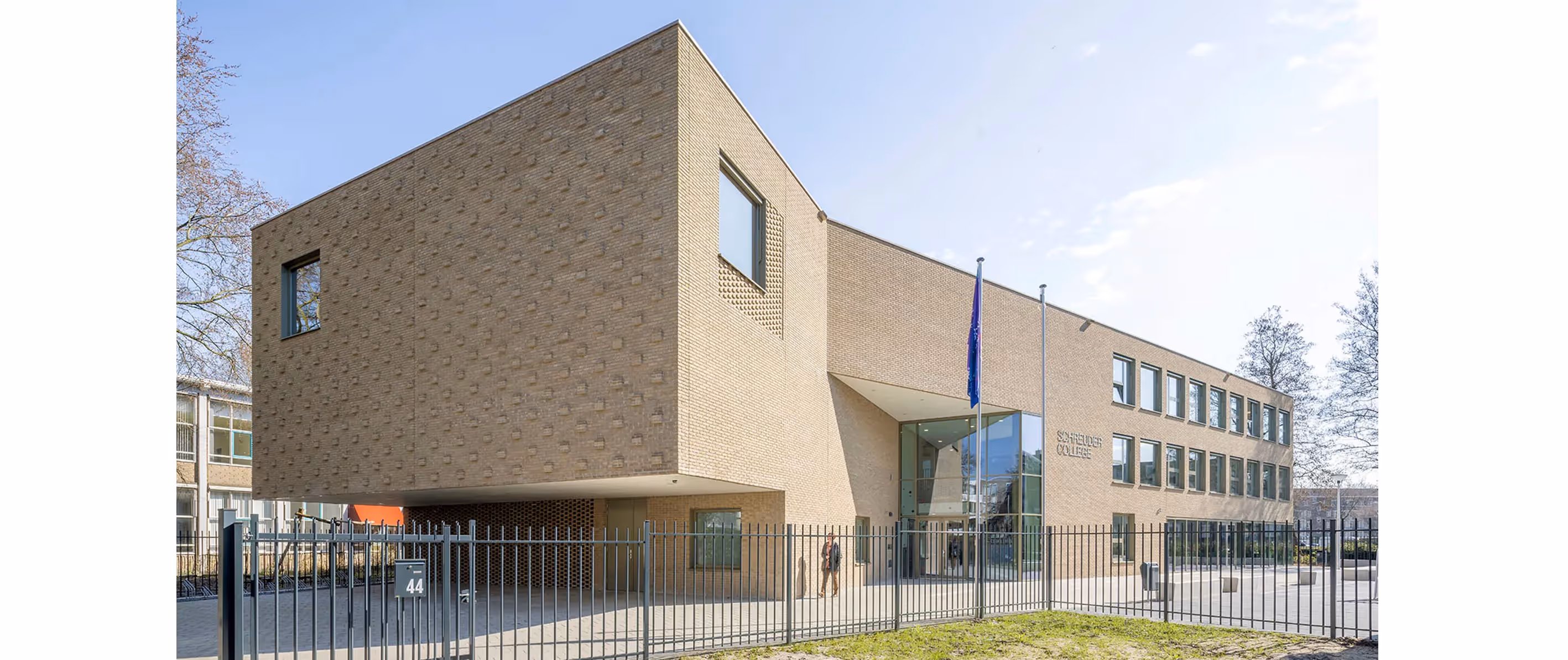 De entrees van de drie grote scholen en de aula zijn geplaatst in glazen bouwdelen, die ingeklemd liggen tussen de bronzen stroken. Door het contrast in materiaalgebruik en hun transparantie zijn ze uitnodigend. Het gebouwdeel met daarin twee speciaal-scholen telt twee entrees aan de parkzijde. Het park vormt een bres tussen het onderwijsgebouw en het sportcomplex waar het tevens aansluiting vindt op de sportvelden en groene Reestdal. Het strokenthema is voortgezet in het opgetild sportcomplex met daaronder de fietsenstallingen en een deel van het parkeren.